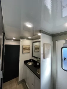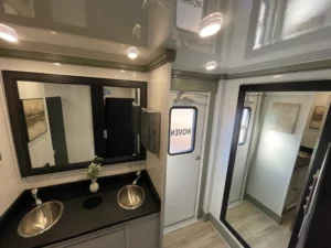Our largest trailer can accommodate up to 300 guests. It includes four private restrooms with flushable toilets, hot water sinks, AC, and premium audio equipment