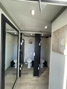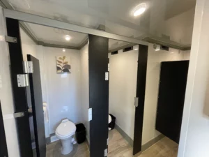 Construction sites can be challenging environments for workers, with limited access to restroom facilities. A restroom trailer on-site can help improve morale and increase productivity by providing workers with a convenient and comfortable facility. Restroom trailers are also an important safety consideration, as they can help minimize the risk of accidents or injuries caused by workers leaving the site searching for a restroom. Our 5 station restroom trailers are designed to meet the specific needs of construction sites including easy maintenance, can be used without nearby power or water, and flexible rental terms from weekly to monthly.
