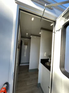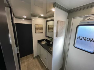 Our smallest trailer with a capacity of up to 150 guests. It includes two private restrooms with flushable toilets, hot water sinks, and AC for added comfort.